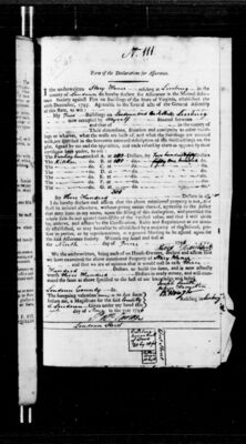 I do hereby declare and affirm that the above mentioned property is not, nor shall be insured elsewhere, without giving notice thereof, agreeably to the policy that may issue in my name, upon the filing of this declaration, and provided the whole sum do not exceed four-fifths of the verified value, and that I will abide by, observe, and adhere to the Constitution, Rules, and regulations as are already established, or may hereafter be established by a majority of the insured, present in person, or by representatives, at a general Meeting to be agreed upon for the said Assurance Society. Witness my hand and seal at [signing location] the [day number spelled out] day of [month] 1796.