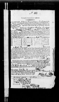 My one Buildings on Loudoun St at Leesburg now occupied by [tenant first and last name] situated between the [adjacent property owner] and that of [adjacent property owner] in the county of Loudoun. Their dimensions, situation and contiguity to other buildings or wharves, what the walls are built of, and what the buildings are covered with, are specified in the hereunto annexed description of the said Buildings on the plat, signed by me and the appraisers, and each valued by them as appears by their certificate here under, to wit: