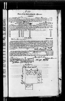 I do hereby declare and affirm that the above mentioned property is not, nor shall be insured elsewhere, without giving notice thereof, agreeably to the policy that may issue in my name, upon the filing of this declaration, and provided the whole sum do not exceed four-fifths of the verified value, and that I will abide by, observe, and adhere to the Constitution, Rules, and regulations as are already established, or may hereafter be established by a majority of the insured, present in person, or by representatives, at a general Meeting to be agreed upon for the said Assurance Society. Witness my hand and seal at [signing location] the [day number spelled out] day of [month] 1796.