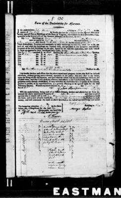 I do hereby declare and affirm that the above mentioned property is not, nor shall be insured elsewhere, without giving notice thereof, agreeably to the policy that may issue in my name, upon the filing of this declaration, and provided the whole sum do not exceed four-fifths of the verified value, and that I will abide by, observe, and adhere to the Constitution, Rules, and regulations as are already established, or may hereafter be established by a majority of the insured, present in person, or by representatives, at a general Meeting to be agreed upon for the said Assurance Society. Witness my hand and seal at [signing location] the [day number spelled out] day of [month] 1796.