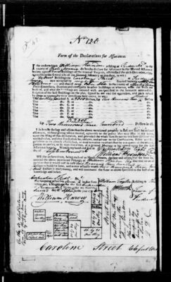 I do hereby declare and affirm that the above mentioned property is not, nor shall be insured elsewhere, without giving notice thereof, agreeably to the policy that may issue in my name, upon the filing of this declaration, and provided the whole sum do not exceed four-fifths of the verified value, and that I will abide by, observe, and adhere to the Constitution, Rules, and regulations as are already established, or may hereafter be established by a majority of the insured, present in person, or by representatives, at a general Meeting to be agreed upon for the said Assurance Society. Witness my hand and seal at [signing location] the [day number spelled out] day of [month] 1796.