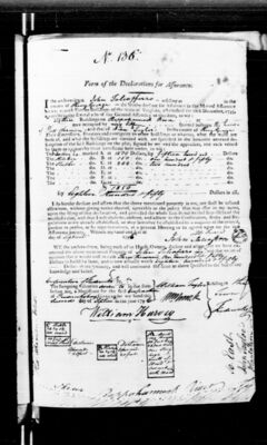 I do hereby declare and affirm that the above mentioned property is not, nor shall be insured elsewhere, without giving notice thereof, agreeably to the policy that may issue in my name, upon the filing of this declaration, and provided the whole sum do not exceed four-fifths of the verified value, and that I will abide by, observe, and adhere to the Constitution, Rules, and regulations as are already established, or may hereafter be established by a majority of the insured, present in person, or by representatives, at a general Meeting to be agreed upon for the said Assurance Society. Witness my hand and seal at [signing location] the [day number spelled out] day of [month] 1796.