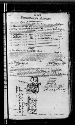 I do hereby declare and affirm that the above mentioned property is not, nor shall be insured elsewhere, without giving notice thereof, agreeably to the policy that may issue in my name, upon the filing of this declaration, and provided the whole sum do not exceed four-fifths of the verified value, and that I will abide by, observe, and adhere to the Constitution, Rules, and regulations as are already established, or may hereafter be established by a majority of the insured, present in person, or by representatives, at a general Meeting to be agreed upon for the said Assurance Society. Witness my hand and seal at [signing location] the [day number spelled out] day of [month] 1801.