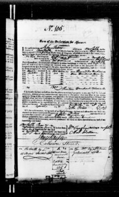 I do hereby declare and affirm that the above mentioned property is not, nor shall be insured elsewhere, without giving notice thereof, agreeably to the policy that may issue in my name, upon the filing of this declaration, and provided the whole sum do not exceed four-fifths of the verified value, and that I will abide by, observe, and adhere to the Constitution, Rules, and regulations as are already established, or may hereafter be established by a majority of the insured, present in person, or by representatives, at a general Meeting to be agreed upon for the said Assurance Society. Witness my hand and seal at [signing location] the [day number spelled out] day of [month] 1796.