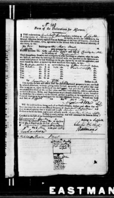 I do hereby declare and affirm that the above mentioned property is not, nor shall be insured elsewhere, without giving notice thereof, agreeably to the policy that may issue in my name, upon the filing of this declaration, and provided the whole sum do not exceed four-fifths of the verified value, and that I will abide by, observe, and adhere to the Constitution, Rules, and regulations as are already established, or may hereafter be established by a majority of the insured, present in person, or by representatives, at a general Meeting to be agreed upon for the said Assurance Society. Witness my hand and seal at [signing location] the [day number spelled out] day of [month] 1796.