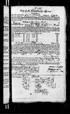 We the underwritten, being each of us House-Owners, declare and affirm that we have examined the above mentioned Property of Charles Whitlock and that we are of opinion that it would cost in cash [value spelled out] Dollars to build the same, and is now actually worth [value spelled out] Dollars in ready money, and will command the same as above specified to the best of our knowledge and belief.