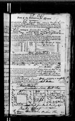 I do hereby declare and affirm that the above mentioned property is not, nor shall be insured elsewhere, without giving notice thereof, agreeably to the policy that may issue in my name, upon the filing of this declaration, and provided the whole sum do not exceed four-fifths of the verified value, and that I will abide by, observe, and adhere to the Constitution, Rules, and regulations as are already established, or may hereafter be established by a majority of the insured, present in person, or by representatives, at a general Meeting to be agreed upon for the said Assurance Society. Witness my hand and seal at [signing location] the [day number spelled out] day of [month] 1796.