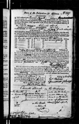 I do hereby declare and affirm that the above mentioned property is not, nor shall be insured elsewhere, without giving notice thereof, agreeably to the policy that may issue in my name, upon the filing of this declaration, and provided the whole sum do not exceed four-fifths of the verified value, and that I will abide by, observe, and adhere to the Constitution, Rules, and regulations as are already established, or may hereafter be established by a majority of the insured, present in person, or by representatives, at a general Meeting to be agreed upon for the said Assurance Society. Witness my hand and seal at [signing location] the [day number spelled out] day of [month] 1796.