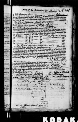 I do hereby declare and affirm that the above mentioned property is not, nor shall be insured elsewhere, without giving notice thereof, agreeably to the policy that may issue in my name, upon the filing of this declaration, and provided the whole sum do not exceed four-fifths of the verified value, and that I will abide by, observe, and adhere to the Constitution, Rules, and regulations as are already established, or may hereafter be established by a majority of the insured, present in person, or by representatives, at a general Meeting to be agreed upon for the said Assurance Society. Witness my hand and seal at [signing location] the [day number spelled out] day of [month] 1796.