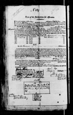 I do hereby declare and affirm that the above mentioned property is not, nor shall be insured elsewhere, without giving notice thereof, agreeably to the policy that may issue in my name, upon the filing of this declaration, and provided the whole sum do not exceed four-fifths of the verified value, and that I will abide by, observe, and adhere to the Constitution, Rules, and regulations as are already established, or may hereafter be established by a majority of the insured, present in person, or by representatives, at a general Meeting to be agreed upon for the said Assurance Society. Witness my hand and seal at [signing location] the [day number spelled out] day of [month] 1796.