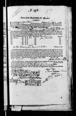 I do hereby declare and affirm that the above mentioned property is not, nor shall be insured elsewhere, without giving notice thereof, agreeably to the policy that may issue in my name, upon the filing of this declaration, and provided the whole sum do not exceed four-fifths of the verified value, and that I will abide by, observe, and adhere to the Constitution, Rules, and regulations as are already established, or may hereafter be established by a majority of the insured, present in person, or by representatives, at a general Meeting to be agreed upon for the said Assurance Society. Witness my hand and seal at [signing location] the [day number spelled out] day of [month] 1796.