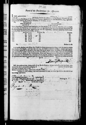 The following computer-generated transcript combines policy index data with a transcript of the blank policy form that was used by Mutual Assurance enumerators. Text in brackets is a description of handwritten information appearing on the policy that has not yet been transcribed. Information in bold is retrieved from the policy index data. While this document provides a general outline of the policy, it is generated via automated processes and may include errors or incomplete information. To read more about this project, please visit our project information page. For further assistance with the policy or to report an error in the transcript, please contact Simpson Library.