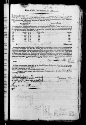 Fire insurance policy from the Mutual Assurance Society of Virginia (MAS) scanned from microfilm. MAS began issuing policies in 1796 and UMW holds microfilm copies of policies created from 1796 to 1867. The Library of Virginia holds the original polices. Computer-generated PDF transcripts are available for download below, listed under Additional Files.