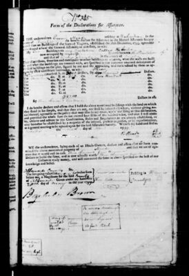I do hereby declare and affirm that the above mentioned property is not, nor shall be insured elsewhere, without giving notice thereof, agreeably to the policy that may issue in my name, upon the filing of this declaration, and provided the whole sum do not exceed four-fifths of the verified value, and that I will abide by, observe, and adhere to the Constitution, Rules, and Regulations as are already established, or may hereafter be established by a majority of the insured, present in person, or by representatives, at a general Meeting to be agreed upon for the said Assurance Society. Witness my hand and seal at [signing location] the [day number spelled out] day of [month] 1799