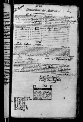 I do hereby declare and affirm that the above mentioned property is not, nor shall be insured elsewhere, without giving notice thereof, agreeably to the policy that may issue in my name, upon the filing of this declaration, and provided the whole sum do not exceed four-fifths of the verified value, and that I will abide by, observe, and adhere to the Constitution, Rules, and Regulations as are already established, or may hereafter be established by a majority of the insured, present in person, or by representatives, at a general Meeting to be agreed upon for the said Assurance Society. Witness my hand and seal at [signing location] the [day number spelled out] day of [month] 1801