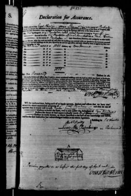 Fire insurance policy from the Mutual Assurance Society of Virginia (MAS) scanned from microfilm. MAS began issuing policies in 1796 and UMW holds microfilm copies of policies created from 1796 to 1867. The Library of Virginia holds the original polices. Computer-generated PDF transcripts are available for download below, listed under Additional Files.