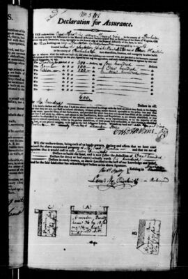 Fire insurance policy from the Mutual Assurance Society of Virginia (MAS) scanned from microfilm. MAS began issuing policies in 1796 and UMW holds microfilm copies of policies created from 1796 to 1867. The Library of Virginia holds the original polices. Computer-generated PDF transcripts are available for download below, listed under Additional Files.