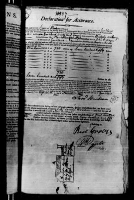 I do hereby declare and affirm that the above mentioned property is not, nor shall be insured elsewhere, without giving notice thereof, agreeably to the policy that may issue in my name, upon the filing of this declaration, and provided the whole sum do not exceed four-fifths of the verified value, and that I will abide by, observe, and adhere to the Constitution, Rules, and Regulations as are already established, or may hereafter be established by a majority of the insured, present in person, or by representatives, at a general Meeting to be agreed upon for the said Assurance Society. Witness my hand and seal at [signing location] the [day number spelled out] day of [month] 1801