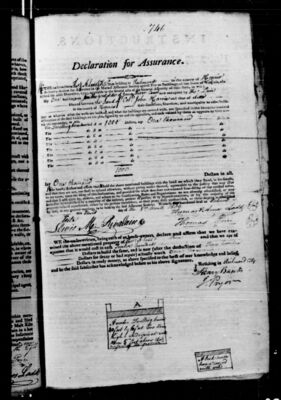 I do hereby declare and affirm that the above mentioned property is not, nor shall be insured elsewhere, without giving notice thereof, agreeably to the policy that may issue in my name, upon the filing of this declaration, and provided the whole sum do not exceed four-fifths of the verified value, and that I will abide by, observe, and adhere to the Constitution, Rules, and Regulations as are already established, or may hereafter be established by a majority of the insured, present in person, or by representatives, at a general Meeting to be agreed upon for the said Assurance Society. Witness my hand and seal at [signing location] the [day number spelled out] day of [month] 1802