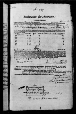 I do hereby declare and affirm that the above mentioned property is not, nor shall be insured elsewhere, without giving notice thereof, agreeably to the policy that may issue in my name, upon the filing of this declaration, and provided the whole sum do not exceed four-fifths of the verified value, and that I will abide by, observe, and adhere to the Constitution, Rules, and Regulations as are already established, or may hereafter be established by a majority of the insured, present in person, or by representatives, at a general Meeting to be agreed upon for the said Assurance Society. Witness my hand and seal at [signing location] the [day number spelled out] day of [month] 1803