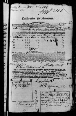 I do hereby declare and affirm that the above mentioned buildings are not, nor shall be insured elsewhere, without giving notice thereof, agreeably to the policy that may issue in my name, upon the filing of this declaration, and provided the whole sum do not exceed four-fifths of the verified value, and that I will abide by, observe, and adhere to the Constitution, Rules, and Regulations as are already established, or may hereafter be established by a majority of the insured, present in person, or by representatives, at a general Meeting to be agreed upon for the said Assurance Society. Witness my hand and seal at [signing location] the [day number spelled out] day of [month] 1803