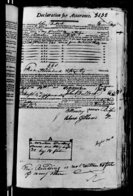 I do hereby declare and affirm that the above mentioned buildings are not, nor shall be insured elsewhere, without giving notice thereof, agreeably to the policy that may issue in my name, upon the filing of this declaration, and provided the whole sum do not exceed four-fifths of the verified value, and that I will abide by, observe, and adhere to the Constitution, Rules, and Regulations as are already established, or may hereafter be established by a majority of the insured, present in person, or by representatives, at a general Meeting to be agreed upon for the said Assurance Society. Witness my hand and seal at [signing location] the [day number spelled out] day of [month] 1803