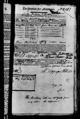 I do hereby declare and affirm that the above mentioned buildings are not, nor shall be insured elsewhere, without giving notice thereof, agreeably to the policy that may issue in my name, upon the filing of this declaration, and provided the whole sum do not exceed four-fifths of the verified value, and that I will abide by, observe, and adhere to the Constitution, Rules, and Regulations as are already established, or may hereafter be established by a majority of the insured, present in person, or by representatives, at a general Meeting to be agreed upon for the said Assurance Society. Witness my hand and seal at [signing location] the [day number spelled out] day of [month] 1803