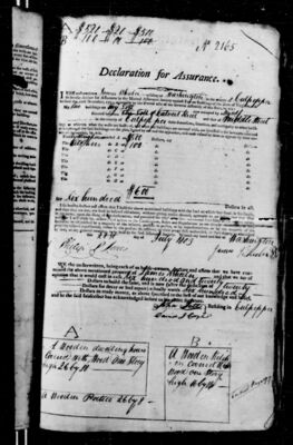 I do hereby declare and affirm that the above mentioned buildings are not, nor shall be insured elsewhere, without giving notice thereof, agreeably to the policy that may issue in my name, upon the filing of this declaration, and provided the whole sum do not exceed four-fifths of the verified value, and that I will abide by, observe, and adhere to the Constitution, Rules, and Regulations as are already established, or may hereafter be established by a majority of the insured, present in person, or by representatives, at a general Meeting to be agreed upon for the said Assurance Society. Witness my hand and seal at [signing location] the [day number spelled out] day of [month] 1803